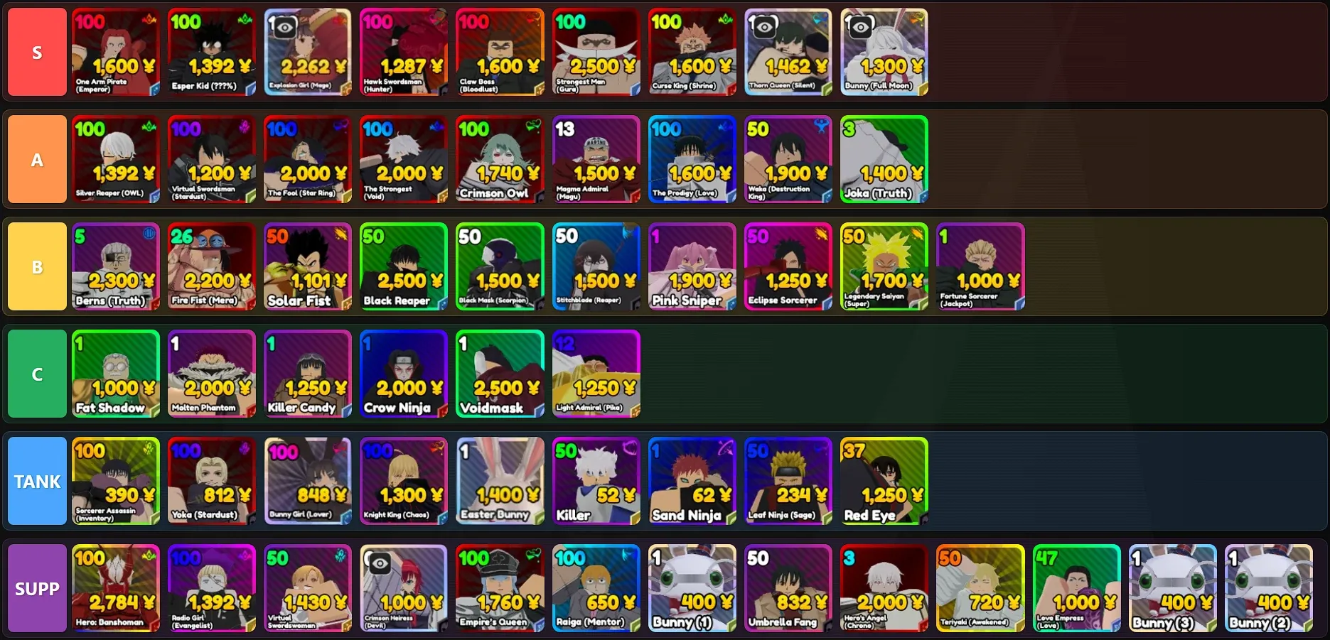 Below-average Secret, Mythic, and evolved Mythic units. Usable for Story mode but not recommended for end-game content.
